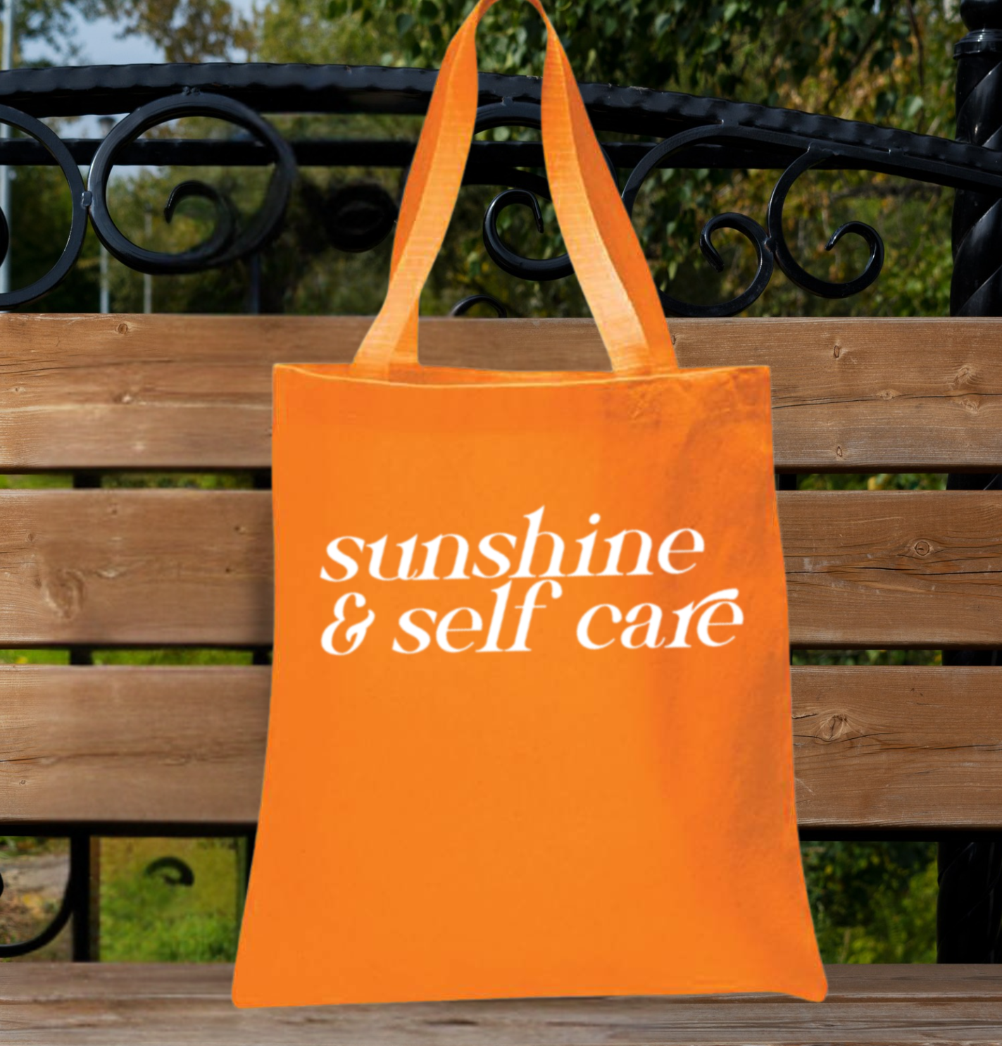 Carry sunshine wherever you go. The “Sunshine & Self Care” tote is a daily reminder to pour into yourself first. With bold, uplifting text on a vibrant orange backdrop, this bag brings positive energy to every errand, outing, or self-care Sunday.